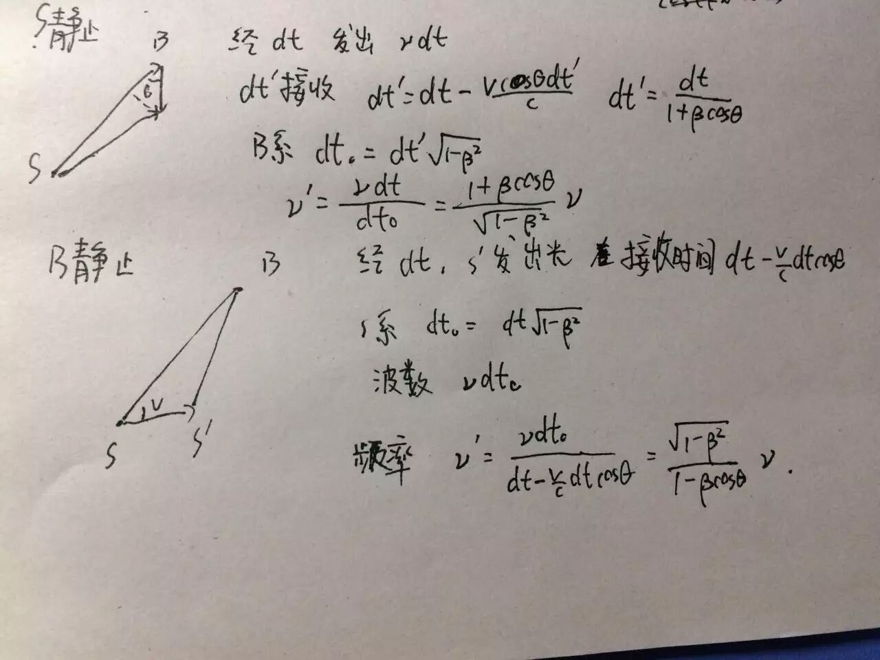 问:为什么假设光源静止和假设观察者静止得到的多普勒效应不一样 但是theta=0或pi的时候就一样了 怎么算才是对的?我想了一天了。。今天推了一堂课。。